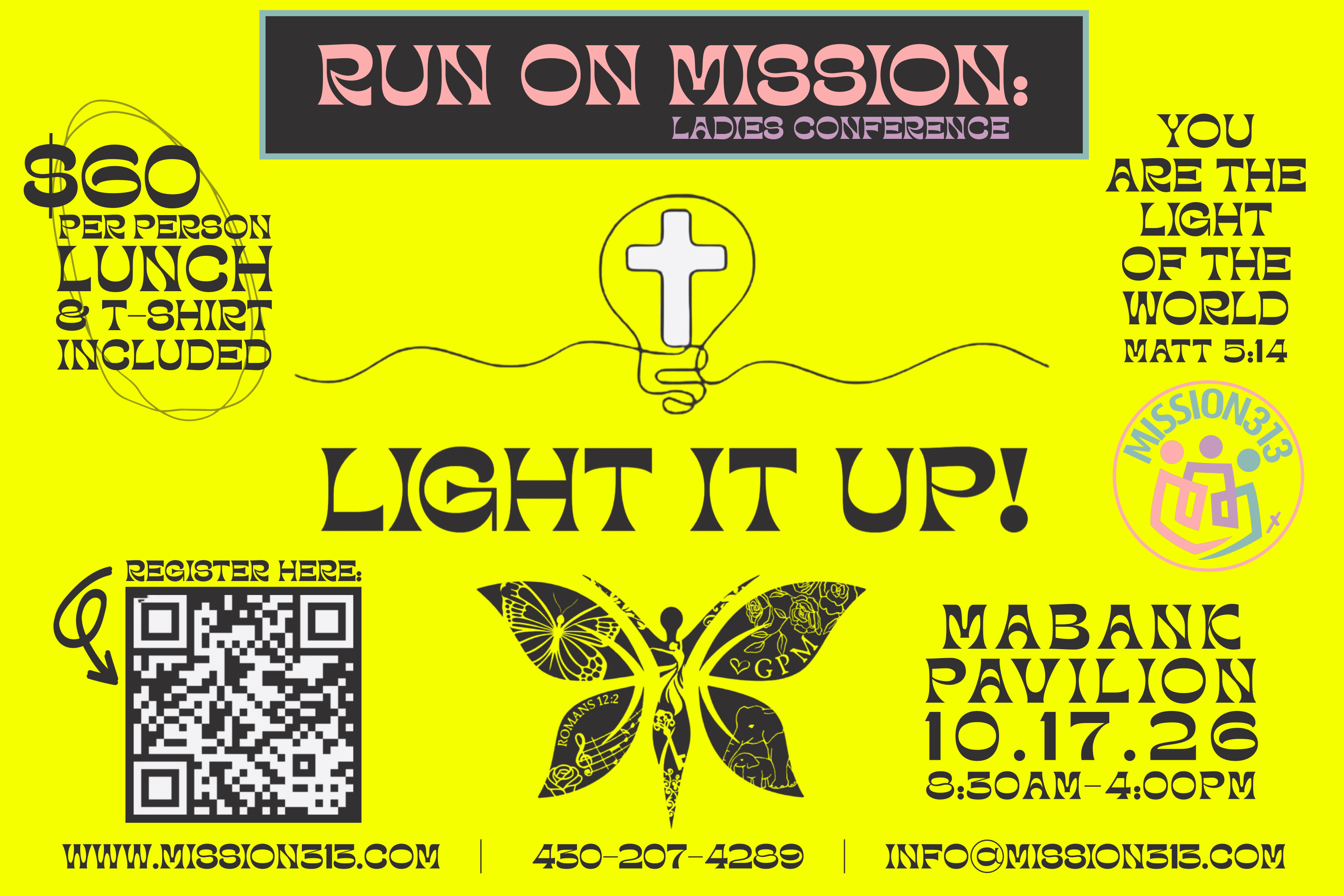 RUN ON MISSION: LIGHT IT UP October 17th, 2026 8:30 am - 4:00 pmRUN ON MISSION: LIGHT IT UP **ANNUAL MISSION313 / GPM LADIES CONFERENCE** Limited supply of shirts available at the conference. Name(Required) First Last Phone(Required)Phone NumberEmail(Required) EmailTicket Options(Required)ConferenceConference / No Shirt313 Collective Leadership313 Collective Leadership / No ShirtShirt SizeSmallMediumLargeXL2X3XTOTAL Payment Options(Required)Please choose your preferred payment and scan the QR needed Venmo Registratrion Form (here) Zelle Cash Credit Card(Required) Address(Required) Street Address City AlabamaAlaskaAmerican SamoaArizonaArkansasCaliforniaColoradoConnecticutDelawareDistrict of ColumbiaFloridaGeorgiaGuamHawaiiIdahoIllinoisIndianaIowaKansasKentuckyLouisianaMaineMarylandMassachusettsMichiganMinnesotaMississippiMissouriMontanaNebraskaNevadaNew HampshireNew JerseyNew MexicoNew YorkNorth CarolinaNorth DakotaNorthern Mariana IslandsOhioOklahomaOregonPennsylvaniaPuerto RicoRhode IslandSouth CarolinaSouth DakotaTennesseeTexasUtahU.S. Virgin IslandsVermontVirginiaWashingtonWest VirginiaWisconsinWyomingArmed Forces AmericasArmed Forces EuropeArmed Forces Pacific State ZIP Code NotesConsent(Required) I agree(Required)I give my consent for Mission313 and any ministry associated with Mission313, to use any photography images and videos taken at said event, on their website and any of their social media accounts. Δ Save the Date SHARE ON Twitter Facebook Buffer LinkedIn Pin It